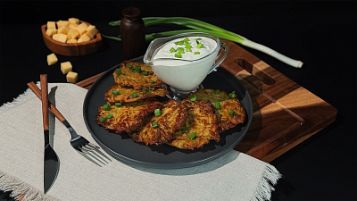 Выложить смесь порциями в чашу аэрогриля столовой ложкой и сформировать плоские драники.