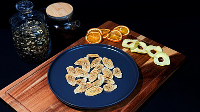 По окончании программы бананы снять с пергамента и выложить на решетку аэрогриля, выставить программу «dehydrate» 80 градусов 1 час. Перевернуть через 30 минут.