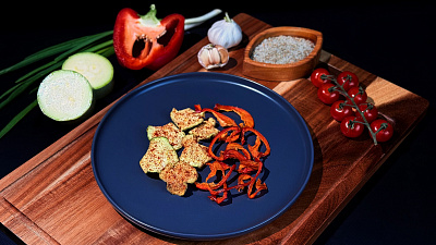 На решетку аэрогриля на пергамент выложить овощи в один слой и выставить программу «dehydrate» 80 градусов 30 минут.