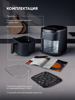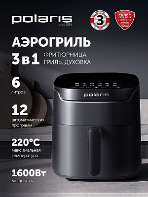 Polaris PAF 5502 — многофункциональный аэрогриль 3в1: заменяет фритюрницу, гриль и духовку. Оснащён сенсорным дисплеем и 12 автоматическими программами: картофель фри, курица, куриные крылья, стейк, рыба, овощи, пирог, пицца, суфохрукты, наггетсы, бекон и креветки. Поддерживает 300+ ручных режимов для точной настройки под любое блюдо. Чаша объёмом 6 л с антипригарным покрытием — удобно готовить большие порции и легко мыть, в том числе в посудомоечной машине. Технология TurboFlow 360° обеспечивает быстрый и равномерный нагрев за счёт циркуляции горячего воздуха, позволяя готовить без масла. Стильный дизайн и вместительная чаша — идеальное решение для всей семьи.