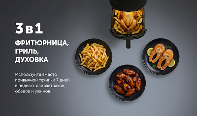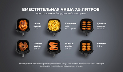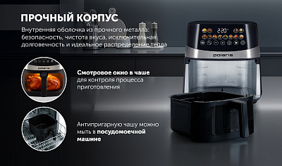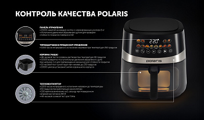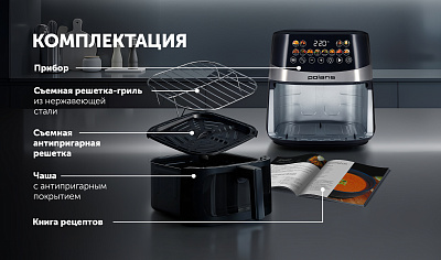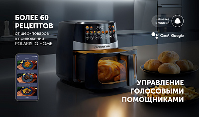 Большая чаша на 7,5 литров со смотровым окном позволяет готовить большие порции и контролировать процесс. Прочное антипригарное покрытие безопасно и подходит для мытья в посудомоечной машине. В комплект входят 2 решётки (нержавеющая и антипригарная), а также книга рецептов. Аэрогриль поддерживает управление через приложение Polaris IQ Home, что делает использование ещё удобнее. Мощность 1800 Вт обеспечивает быстрый нагрев и стабильный результат при ежедневной готовке.