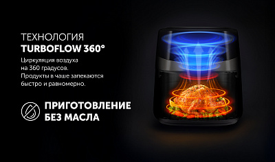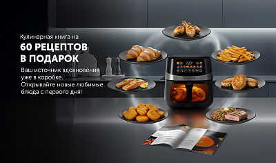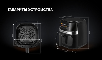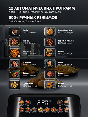 Модель оснащена 12 автоматическими программами (картофель фри, курица, крылья, стейк, рыба, овощи, пирог, пицца, сухофрукты, наггетсы, бекон, креветки) и более чем 300 ручными режимами. Настройки времени и температуры легко регулировать через удобный сенсорный цветной дисплей.
