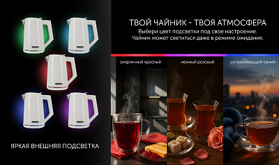 Достоинства: Современный дизайн, имеется яркая внешняя подсветка, которую можно настраивать. Регулировка температуры с точностью до 5 градусов, нужную для заваривания разных видов чая выбираешь. Из необычного - достаточно бесшумная работа.
