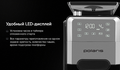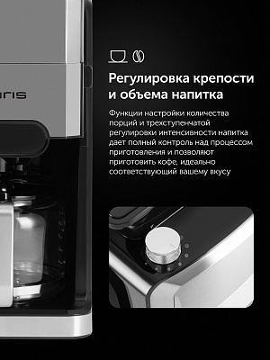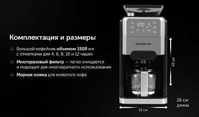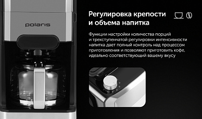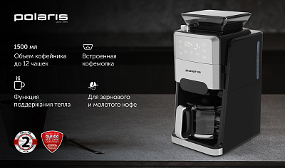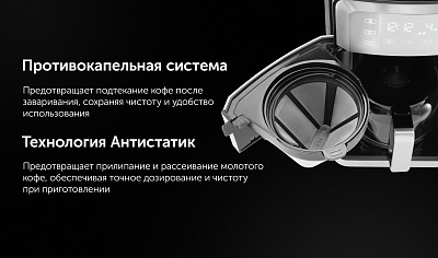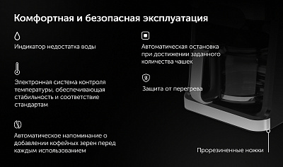 Капельная кофеварка Grind And Brew с автоматической функцией помола и заваривания обеспечивает удобство и качество приготовления кофе. Оснащена конусными жерновами из нержавеющей стали, что позволяет использовать как зерна, так и молотый кофе. Вместительный стеклянный кофейник и резервуар для воды имеют объем 1,5 литра, что соответствует 12 стандартным чашкам. Управление осуществляется через сенсорную панель с возможностью настройки количества чашек и интенсивности напитка в трех режимах. Предусмотрена функция автоматической остановки, индикатор недостатка воды и функция сохранения тепла с четырьмя уровнями времени (от 30 минут до 2 часов). Электронная система контроля температуры соответствует стандартам ECBC/SCAA, обеспечивая стабильное качество кофе. Дополнительные возможности включают антистатическую функцию для молотого кофе и удобную систему подачи кофейных зерен.