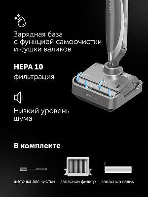 | Комплектация | пылесос, батарея, электрическая щетка для пола, зарядная база, съемная ручка, резервуар для чистой воды, бак для грязной воды, зарядный адаптер, щетка для чистки, руководство по эксплуатации, запасной фильтр в комплекте |