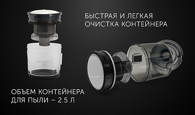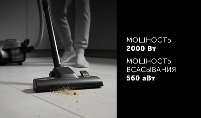 Пылесос циклонного типа с мощностью мотора 2000 Вт и мощностью всасывания 560 аВт.