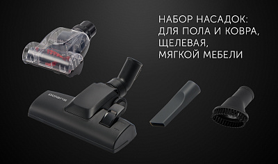 | Комплектация | пылесос, гибкий шланг, телескопическая труба, инструкция по эксплуатации, щетка для пола и ковров, турбощетка, комбинированная насадка, круглая щетка |