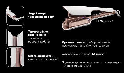 Комментарий: Удачное приобретение. Все получается быстро и бережно воздействует на волосы. Температура варьируется от 140 до 200 с интервалом в 10 градусов. еще можно выбрать и время создания локона от 4 до 10 сек. Тут все зависит от типа волос. Сам по себе стайлер крепкий, дизайн интересный, при нагреве запаха не исходит.