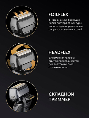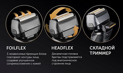 FoilFlex - 3 независимых бреющих блоков повторяют контуры лица, создавая улучшенное соприкосновение с кожей.