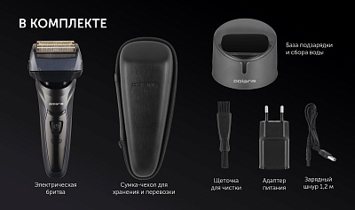 Комплектация: зарядная база, защитная крышка, твердый чехол для хранения и перевозки, щеточка для очистки, адаптер, шнур 1.2м