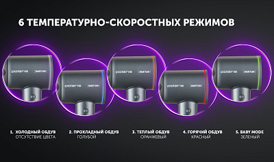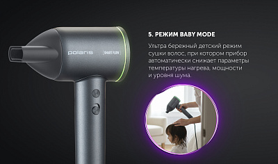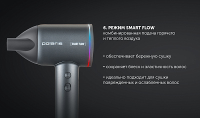 5 температурно-скоростных режимов, включая режим Smart Flow - комбинированная подача воздуха, которая обеспечивает ультрабережную сушку, даже самых поврежденных волос.