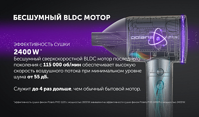 Фен с бесщеточным Digital мотором последнего поколения обеспечивает эффективность сушки мощностью 2400W со скоростью мотора 115 000 об/мин. при минимальном уровне шума 55 ДБ.