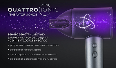 Встроенный генератор ионов Quattro Ionic создает 4D эффект здоровых волос. 900 000 000 отрицательно заряженных ионов устраняют статистическое электричество, сохраняют яркость цвета, предотвращают сечение на кончиках, сохраняют естественную влагу.