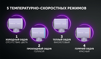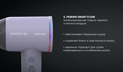 5 температурно-скоростных режимов, включая режим Smart Flow - комбинированная подача воздуха, которая обеспечивает ультрабережную сушку, даже самых поврежденных волос.