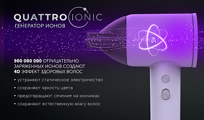 Встроенный генератор ионов Quattro Ionic создает 4D эффект здоровых волос. 900 000 000 отрицательно заряженных ионов устраняют статистическое электричество, сохраняют яркость цвета, предотвращают сечение на кончиках, сохраняют естественную влагу.