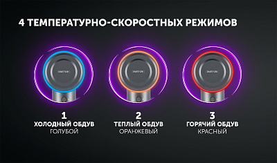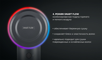 4 температурно-скоростных режима, включая режим Smart Flow - комбинированная подача воздуха, которая обеспечивает ультрабережную сушку, даже самых поврежденных волос.