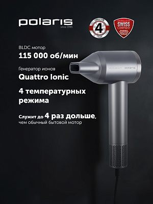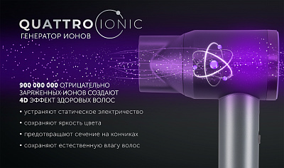 Встроенный генератор ионов Quattro Ionic создает 4D эффект здоровых волос. 900 000 000 отрицательно заряженных ионов устраняют статистическое электричество, сохраняют яркость цвета, предотвращают сечение на кончиках, сохраняют естественную влагу.
