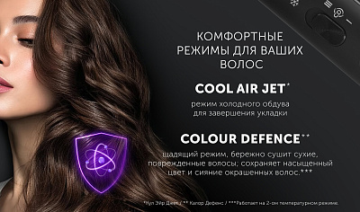 Режим Colour Defence - щадящий режим сушки бережно сушит сухие, поврежденные волосы; сохраняет насыщенный цвет и сияние окрашенных волос.*