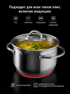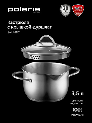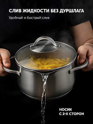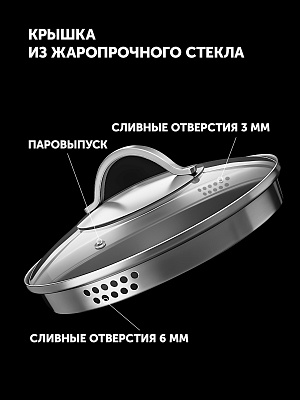 Крышка из жаропрочного стекла с отверстием для выпуска пара и специальным широким металлическим ободом с отверстиями для удобного слива жидкости.