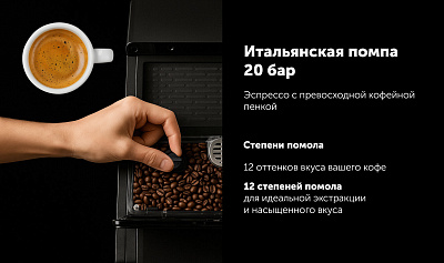 Кофемашина оснащена уникальной системой вспенивания молока Profi-cream, что позволяет готовить неповторимую молочную пену кремообразной консистенции. В данной модели предустановлено 5 автоматических программ: эспрессо, кофе, капучино, латте и горячее молоко. Каждую из этих программ пользователь может настроить индивидуально исходя из своих вкусовых предпочтений. Благодаря помпе итальянского производства с давлением 20 бар, кофемашина готовит насыщенный эспрессо с превосходной кофейной пенкой.