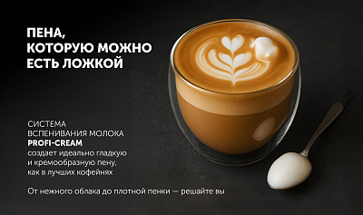 Кофемашина оснащена уникальной системой вспенивания молока Profi-cream, что позволяет готовить неповторимую молочную пену кремообразной консистенции. В данной модели предустановлено 6 автоматических программ: эспрессо, кофе, капучино, латте, горячее молоко и горячая вода. Каждую из этих программ пользователь может настроить индивидуально исходя из своих вкусовых предпочтений. Благодаря помпе итальянского производства с давлением 20 бар, кофемашина варит насыщенный эспрессо с превосходной кофейной пенкой. Сенсорное управление позволит приготовить любимый напиток всего одним касанием.