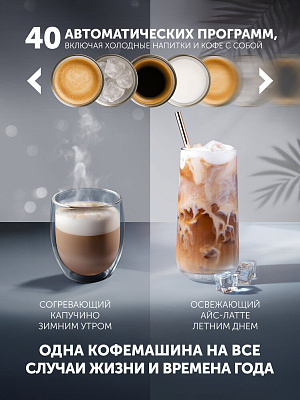 Кофемашина оснащена уникальной системой вспенивания молока Profi-cream, что позволяет готовить неповторимую молочную пену кремообразной консистенции. В данной модели предустановлено 40 автоматических программ: горячие напитки (эспрессо, ристретто, лунго, американо, капучино, латте, флэт уайт, макиато, кофе с молоком, латте макиато, молочная пена, горячая вода), холодные напитки и кофе с собой. Каждую из этих программ пользователь может настроить индивидуально исходя из своих вкусовых предпочтений. Сенсорное управление позволит приготовить любимый напиток всего одним касанием. Благодаря помпе с давлением 20 бар, кофемашина готовит насыщенный эспрессо с превосходной кофейной пенкой. Режим "кофе с собой" позволяет готовить напитки, используя термокружку.