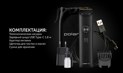 В комплекте: прибор, съемная телескопическая насадка, сетевой адаптер, провод USB Type-C 1,8 м, масло для смазки режущего блока и щеточка для чистки, сумка для хранения.