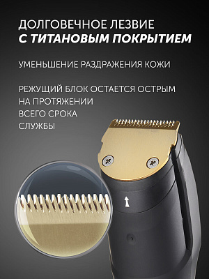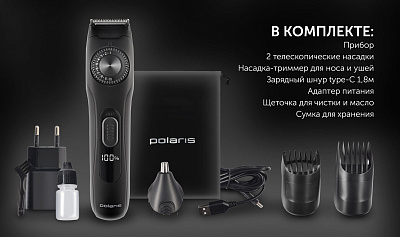 В комплекте: прибор, 2 съемных телескопических насадки, насадка-триммер для носа и ушей, адаптер, USB-кабель 1,8 м, масло для смазки режущего блока и щеточка для чистки, сумка для хранения.