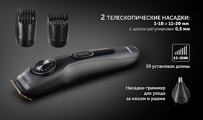 2 съемных телескопических насадки: 1-10 и 11-20 мм + насадка-триммер для носа и ушей.