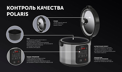 Режимы работы: Мой рецепт Plus, Суп, Крупа, Жарка, Выпечка, Молочная каша, Плов, Пицца, Соте, Разогрев, Овсянка, Томление, Запекание, Бобы, Холодец, Йогурт, Тушение, Варенье, Варка на пару, Компот, Стерилизация.