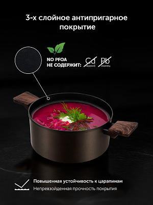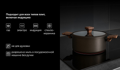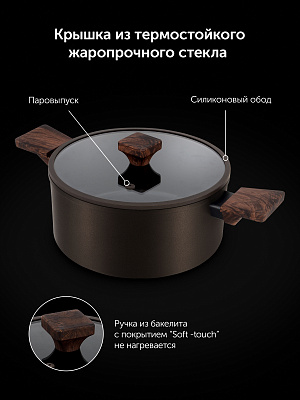 Специальное утолщенное дно обеспечивает быстрый и равномерный нагрев посуды. Крышка из жаропрочного стекла с силиконовым ободом с отверстием для выпуска пара.