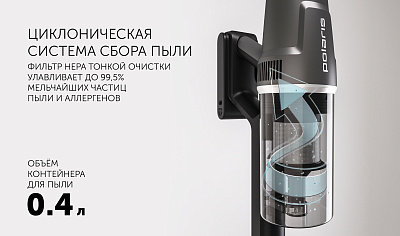 Беспроводной вертикальный пылесос с турбощеткой и 4 дополнительными насадками станет верным помощником в заботе о доме. Он легко превращается в компактный ручной пылесос, а при помощи сгибающейся трубы он легко достанет до самых труднодоступных мест. Моющая насадка поможет освежить полы после сухой уборки или же убрать локальные загрязнения на полу в прихожей или на кухне. Мощной инвенторный мотор 500 Вт обеспечит непрерывную работу прибора до 60 минут, на сам мотор действует расширенная гарантия 10 лет! Технология Cyclonic Smart увеличит время работы пылесоса от одного заряда, подбирая необходимую мощность всасывания в зависимости от степени загрязнения.