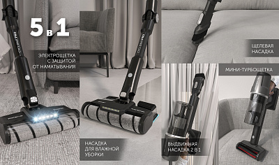 Доп. аксессуары: щелевая насадка, насадка 2 в 1, мини турбощетка, насадка для влажной уборки, настенное крепление, напольная подставка