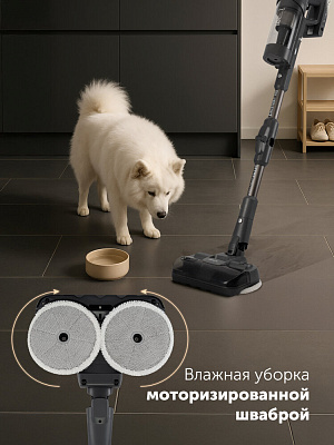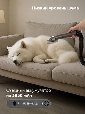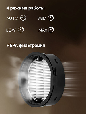 Устройство оснащено аккумулятором емкостью 3950 мАч, что обеспечивает до 85 минут автономной работы на одном заряде. Ручной пылесос с мощностью мотора в 800 Вт и мощностью всасывания в рекордные 280 аВт эффективно удаляет пыль, волосы, шерсть животных и другой мусор с различных покрытий, включая ковры, паркет, плитку и ламинат. Для разных типов загрязнений предусмотрены четыре режима мощности: auto, low, mid, max. Мощный аппарат предназначен для сухой и влажной уборки.