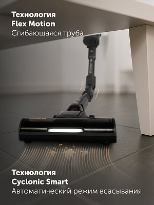 Технология Flex Motion дает свободу движения на 360 градусов благодаря сгибающейся трубе и особой конструкции устройства, что облегчает уборку труднодоступных мест. Встроенный контейнер для пыли объемом 0,45 литра очищается одним движением. В комплекте есть зарядная станция, обеспечивающая удобное хранение прибора и доп. насадок.