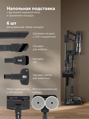 В набор входят 6 дополнительных насадок: мини-турбощетка для мебели с УФ излучением, насадка 2в1, щелевая насадка с LED подсветкой, моторизированная швабра, гибкий шланг, насадка для животных, электрощетка с LED подсветкой, насадка для мебели. Все это позволяет чистить не только полы, но и мебель, диван, ковры, шторы, а также поддерживать чистоту в салоне автомобиля, проводить груминг животных.