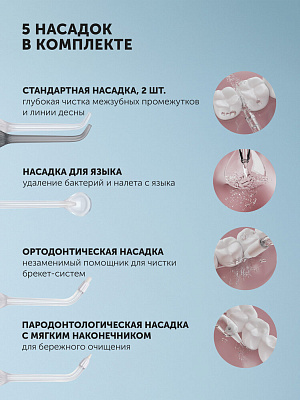 | Насадки в комплекте | струйная насадка, ортодонтическая (для брекетов), пародонтологическая, для очистки языка |