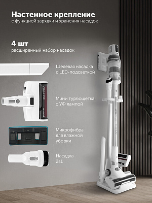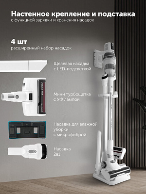 В комплекте есть напольная подставка с настенным креплением, обеспечивающая удобное хранение прибора и доп. насадок.