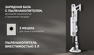 В комплекте есть зарядная база с пыленакопителем 3 л, обеспечивающая удобное хранение прибора и доп. насадок, его зарядку и самоочистку.