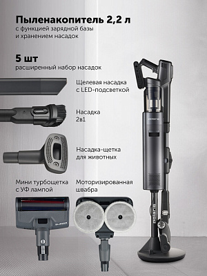 В комплекте есть зарядная база с пыленакопителем 2,2 л, обеспечивающая удобное хранение прибора и доп. насадок, его зарядку и самоочистку.