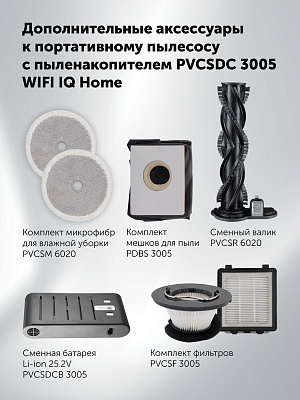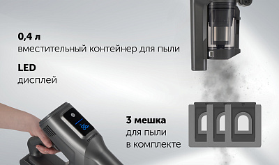 | Комплектация | пылесос, зарядная база-пыленакопитель, батарея, насадка 2 в 1, щелевая насадка с LED подсветкой, мини турбощетка с УФ, щетка для животных, моторизированная швабра, мешок для пыли 3 шт., гибкий шланг, сумочка для хранения аксессуаров, гарантийный талон, инструкция |