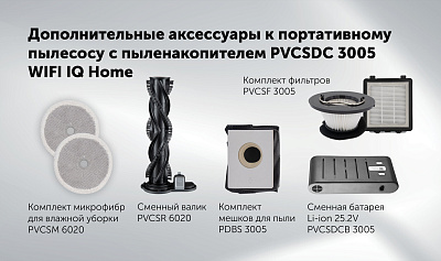 В набор входят 5 дополнительных насадок: мини-турбощетка для мебели с УФ-излучением, насадка 2в1, щелевая насадка с LED подсветкой, моторизированная швабра, электрощетка с LED подсветкой, гибкий шланг и насадка для животных, 3 шт сменных мешков. Все это позволяет чистить не только полы, но и мебель, диван, ковры, шторы, а также поддерживать чистоту в салоне автомобиля.