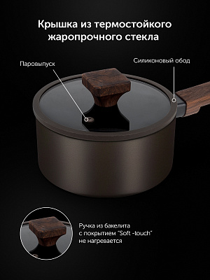 Специальное утолщенное дно обеспечивает быстрый и равномерный нагрев посуды. Крышка из жаропрочного стекла с силиконовым ободом с отверстием для выпуска пара.