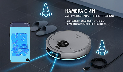 • Встроенная камера с ИИ для распознавания препятствий, распознает объекты и отмечает их местоположение на карте.