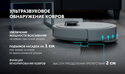 • Запрет влажной уборки на коврах: робот приподнимает насадки для влажной уборки при заезде на ковер