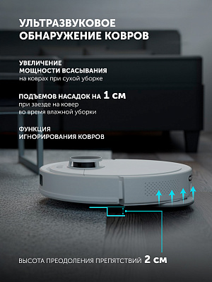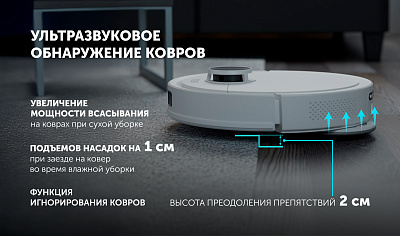 • Запрет влажной уборки на коврах: робот приподнимает насадки для влажной уборки при заезде на ковер