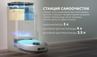 Полноценная станция самоочистки надолго избавит от хлопот по уборке, ведь робот сам сделает все, что нужно: соберет сухой мусор, вымоет пол с помощью вращающихся насадок из микрофибры, промоет и высушит насадки. Вам останется только слить воду из контейнеров. Дополнительные возможности при уборке на коврах: увеличение мощности всасывания при сухой уборке и поднятие насадок с микрофиброй на ковре при влажной уборке. Расширенные функции станции: подогрев воды для промывки насадок с микрофиброй, сушка насадок горячим воздухом, функция очистки основной щетки от волос. Тщательная уборка вдоль стен и углов при помощи выдвижного держателя насадки для влажной уборки.