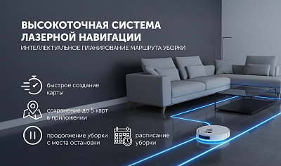 • Высокоточная система лазерной навигации для построения карты помещения, сохраняет до 5 карт