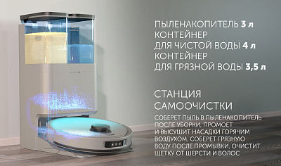 Полноценная станция самоочистки надолго избавит от хлопот по уборке, ведь робот сам сделает все, что нужно: соберет сухой мусор, вымоет пол с помощью вращающихся насадок из микрофибры, промоет и высушит насадки. Вам останется только слить воду из контейнеров. Дополнительные возможности при уборке на коврах: увеличение мощности всасывания при сухой уборке и поднятие насадок с микрофиброй на ковре при влажной уборке. Расширенные функции станции: подогрев воды для промывки насадок с микрофиброй, сушка насадок горячим воздухом, функция очистки основной щетки от волос. Тщательная уборка вдоль стен и углов при помощи выдвижного держателя насадки для влажной уборки.