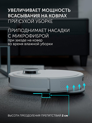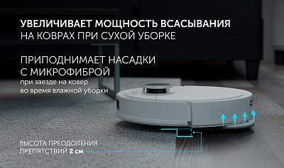 • Запрет влажной уборки на коврах: робот приподнимает насадки для влажной уборки при заезде на ковер